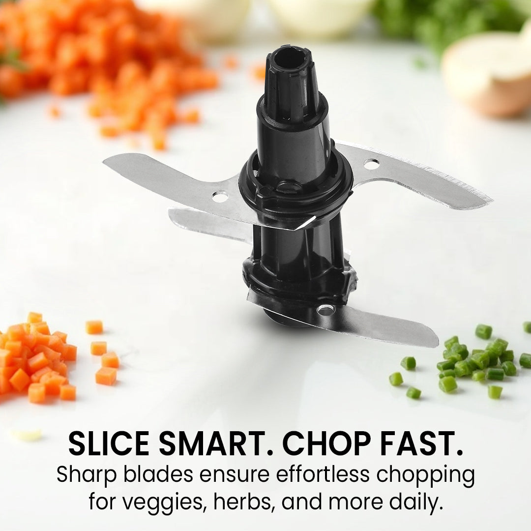 Edge 300W electric chopper is powered by a robust 100% copper motor, ensuring efficient and long-lasting performance. Equipped with dual stainless steel turbo blades, it effortlessly chops and blends with precision. The durable 800ML polycarbonate jar is lightweight yet sturdy, complemented by a resilient ABS build for added durability. Its easy removable blade design simplifies cleaning, while the press-and-chop function provides seamless operation. The easy-grip handle ensures comfort and control, making it an essential tool for quick and hassle-free food preparation.