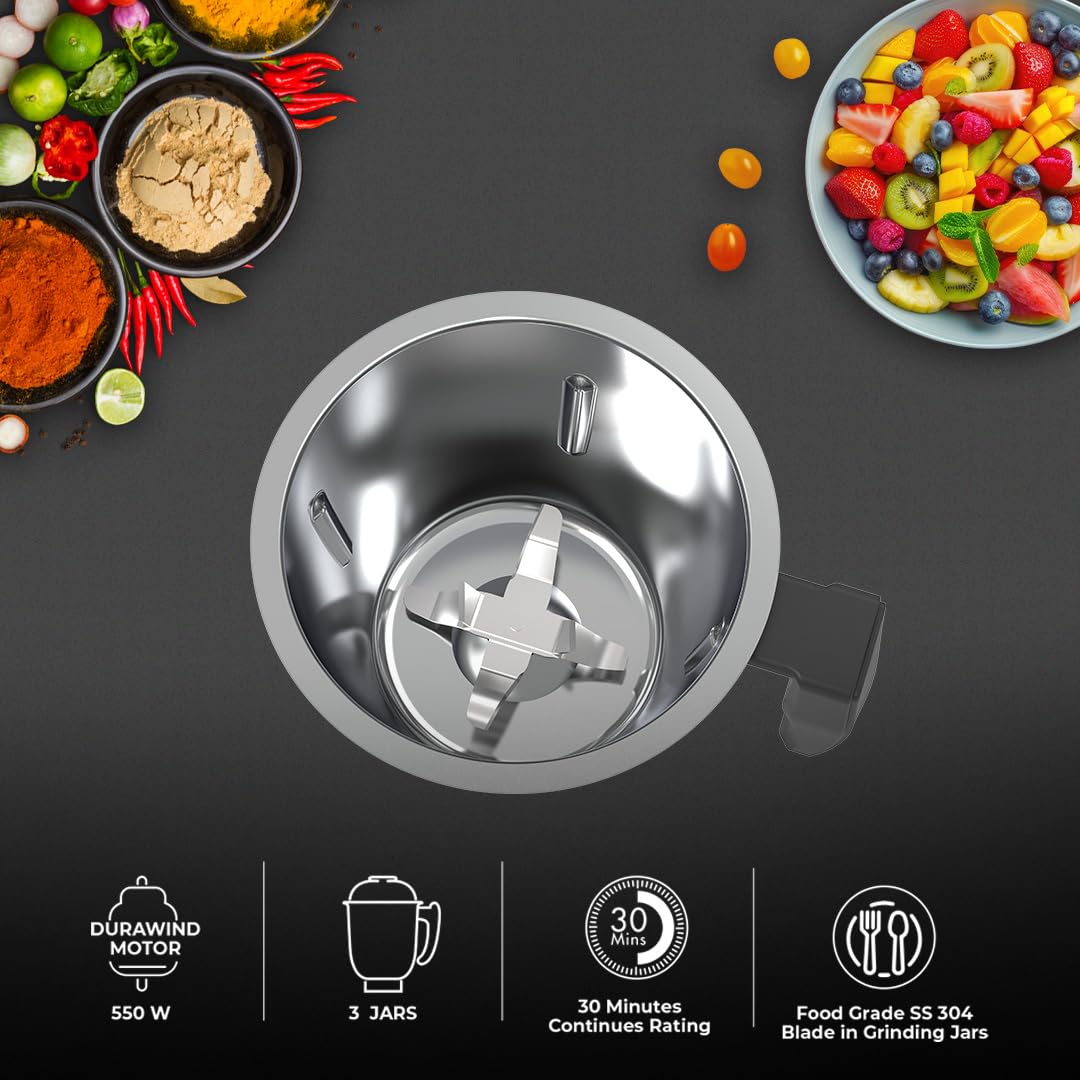 Mewto Prius 550W Mixer Grinder | Durawind Motor, 3 Multi-Purpose Jars, 30-Minute Continuous Rating, Stainless Steel 304 Blade